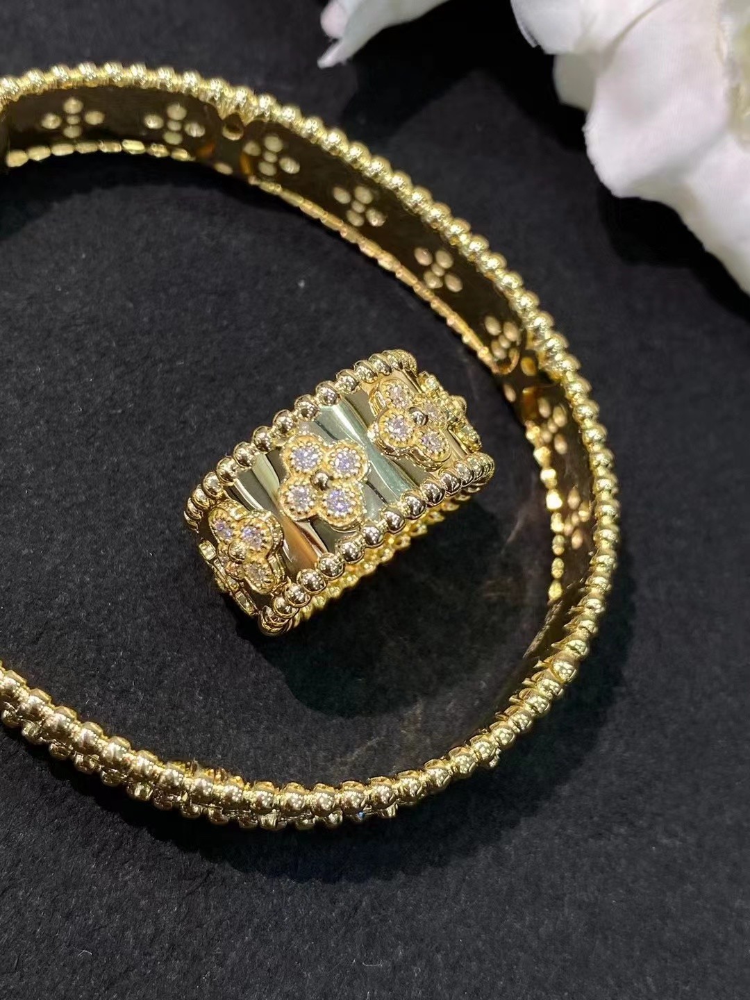 As criações da coleção de trevos PerléeTM são ornamentadas com motivos preciosos de trevo Custom Brand símbolo de sorte.